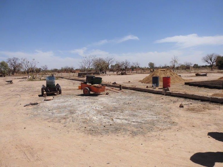 Stand: 18.02.2015: Einfriedung des Grundstücks: Wie fast ale Häuser in der Umgebung wird um die Anlage eine Mauer zum Schutz gegen frei-laufende Tiere (Ziegen, Rinder), die die Pflanzen der PKA fressen könnten, gebaut.