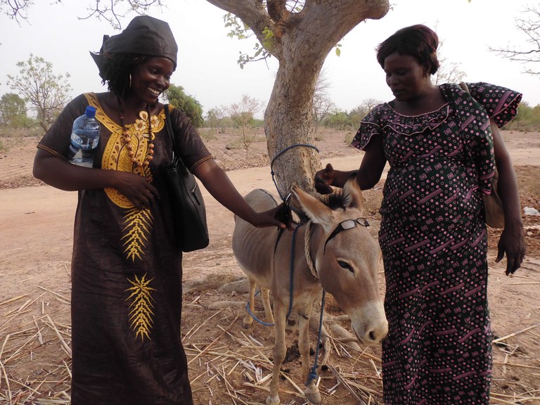 CIMG2444.JPG (Mme Zerbo und Mme Kargougou mit dem neuen Esel für den Wassertransport)