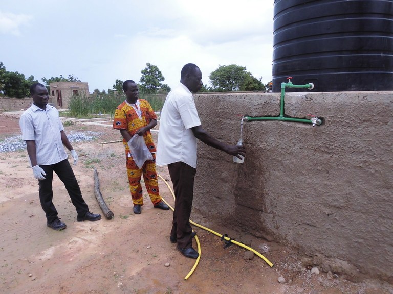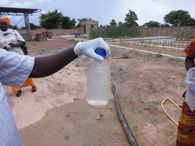 20150807 http://www.ressourcenschutz-burkina-faso.org/projekte/pilot-pflanzenklaeranlage-in-ouagadougou/bilder-von-der-pka/20150807 http://www.ressourcenschutz-burkina-faso.org/logo.png 20150807 Entnahme einer Wasserprobe zur Analyse durch die ONEA. CIMG2806.JPG